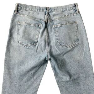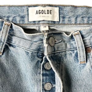 These Agolde jeans feature a classic boot cut silhouette in a soft blue hue, offering a vintage-inspired wash for a timeless look. The high-waisted design provides a flattering fit through the hips and thighs, flaring out below the knees for a stylish finish. A raw hem adds a contemporary touch to these versatile jeans, perfect for casual outings.