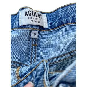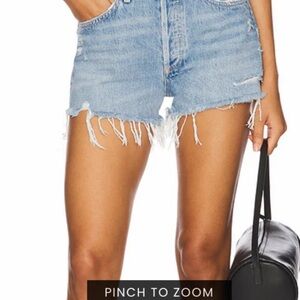 These Agolde jean shorts feature a light blue denim color with a high-waisted cut and a stylish distressed finish. The frayed edges and visible rips add a trendy, worn-in look, making them perfect for casual outings. Crafted from quality denim, they offer both comfort and a chic appearance.