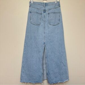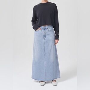 Preowned Agolde Hilla maxi skirt in Practice (light blue wash). Mid-rise, classic 5-pocket styling, raw hem, and back slit. 100% regenerative cotton. Style A9111-1141.