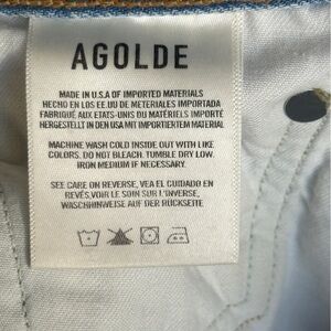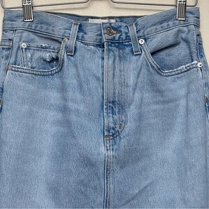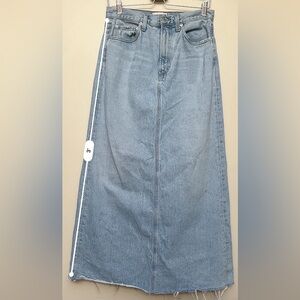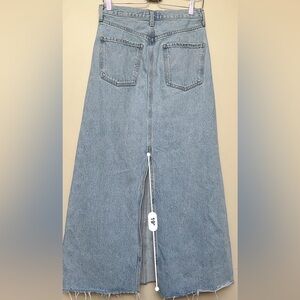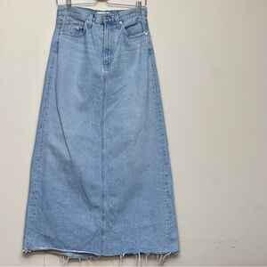 Keywords: Agolde, Hilla skirt, denim maxi skirt, raw hem, light wash denim, practice wash, high waist skirt, women’s size 26, casual denim
