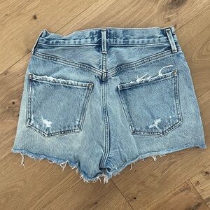 Trendy Agolde jean shorts with a distressed look. Perfect for casual wear. Classic blue denim style.