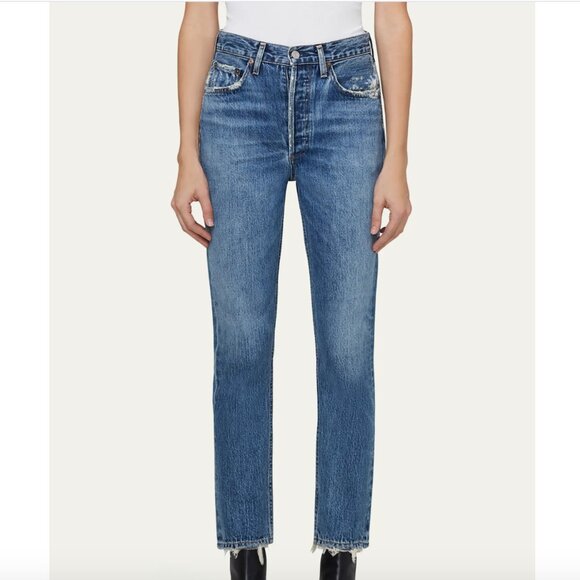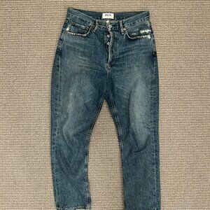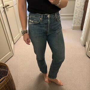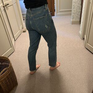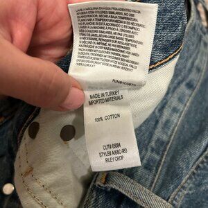 New condition. Soft 100% cotton. The perfect worn-in straight leg jeans. I am 5'4" and they hit right at my foot.