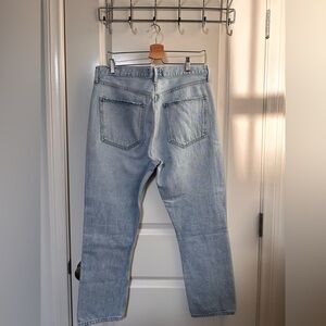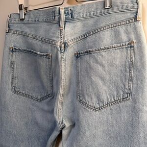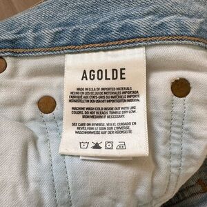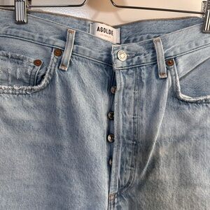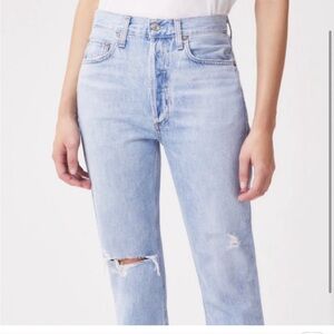 Agolde High Rise Riley Cropped Jeans in color Shatter, size 30. Light wash with knee slit, non stretch cotton denim. Inseam 28in with button fly. Perfect for spring summer outfits