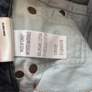 Light fading and whiskering with ripped detail. Frayed hem. Split leg openings.