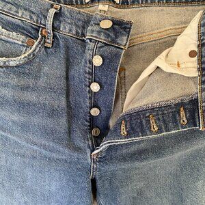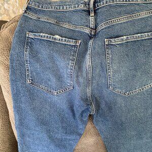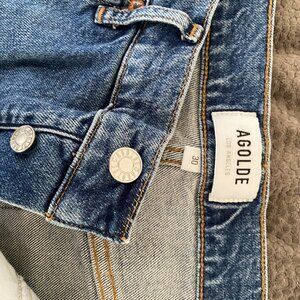These are Agolde jeans sold through Jenni Kayne site. Straight-legged. Slight distressing details are original to the jeans. In excellent condition.