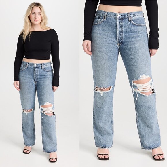 AGOLDE Jeans 90s Straight Leg Lana Distressed New With Tags. Blogger favorite! 90's-inspired Lana jeans are cut for a relaxed silhouette in the label's Backdrop wash. A true straight. The Lana sits low on your waist with a slightly relaxed, full length leg. This vintage-inspired fit is crafted with an authentically worn-in feel.