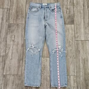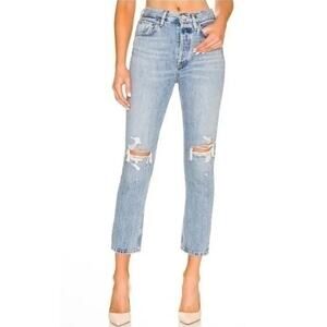 Agolde "Riley" jeans in a women’s size 25. These premium high-rise, cropped jeans feature a button fly and light vintage-style wash with intentional distressing throughout. Crafted from non-stretch denim for a true vintage fit and feel. Designed to flatter with a structured silhouette and ankle-grazing hem.