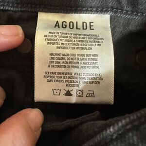 Elevate your denim game with these AGOLDE Women's Nico High Rise Slim Button Fly Distressed Jeans. These jeans boast a stylish 5-pocket design with a button and zipper closure and a logo accent. The high-rise waistline and slim fit make them perfect for any season, whether it's summer, fall, or spring.
