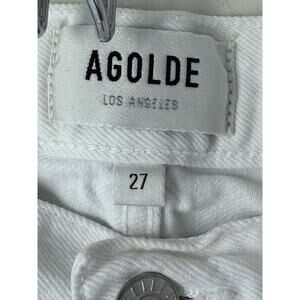 The product is a pair of Agolde Jeans in a women's size 27, featuring a white color with a raw denim fabric wash. These straight leg jeans have a button fly closure and a high rise waist, offering a regular fit with a 25-inch inseam.