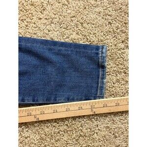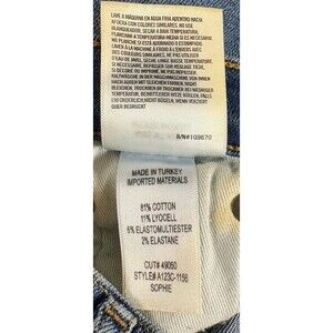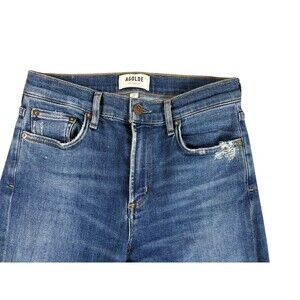 These are Agolde Sophie distressed skinny jeans for women in size 27. They feature a mid-rise with a 10" rise and a 28" inseam. Made of denim fabric with a blend of cotton, lyocell, elastomultiester, and elastane, they have a zip closure and a 5-pocket design. The jeans are in a solid blue color with stretch and distressed accents, suitable for all seasons.