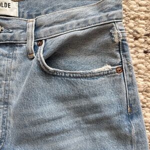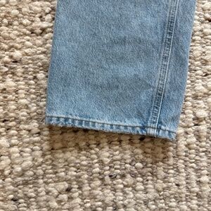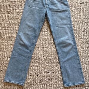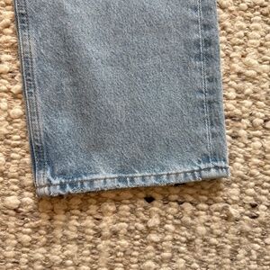 Light wash jeans with natural distressing at pockets and hems. Very soft material. Straight leg