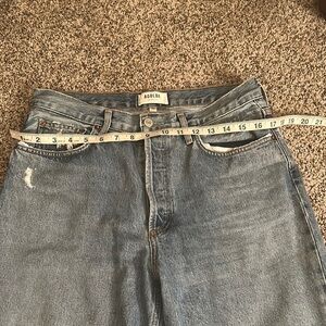 Trendy light blue jeans with distressed details. Ideal for everyday style.