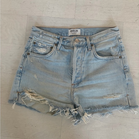 Agolde Light Blue Ripped Jean Shorts