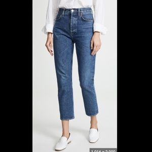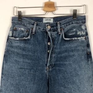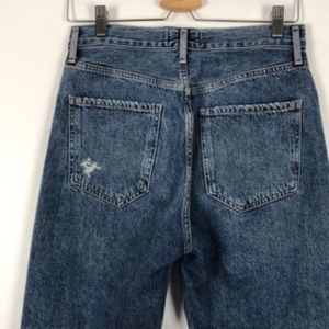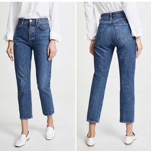 Agolde Los Angeles Riley high rise straight leg 5 pocket distressed jeans.