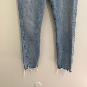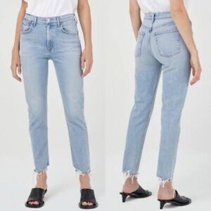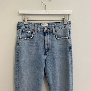 14 inches at waistband, 10 inch rise, 27 inches long.