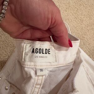 AGOLDE white jean shorts with button-up front. Frayed hem adds a trendy touch. Perfect for casual wear. Worn once.