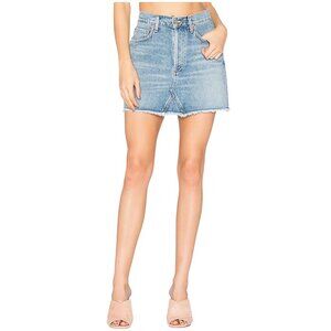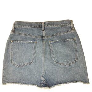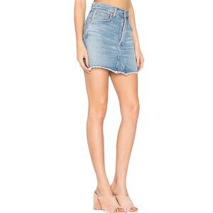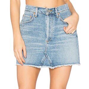 Agolde Quinn High Rise Jean Denim Mini Skirt Size 28, Blue Devotee Wash, Distressed, Raw Frayed Hem, Cotton