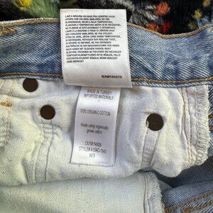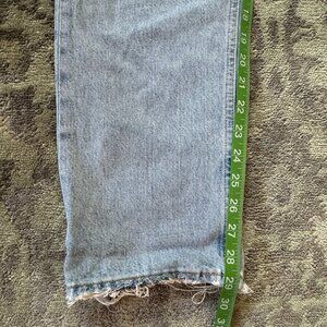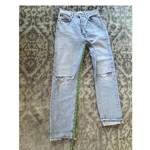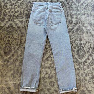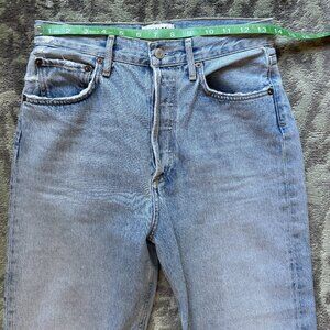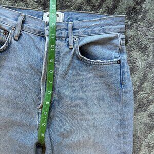 Agolde Riley Crop High Rise Straight Jeans.Looks like vintage casted medium indigo with distressing. Feels like washed down, soft organic non-stretch denim.