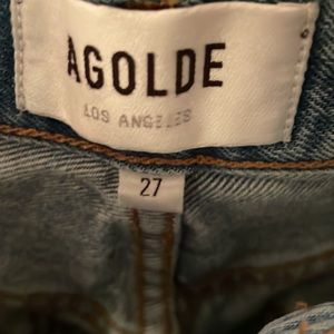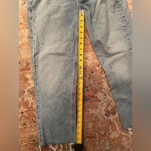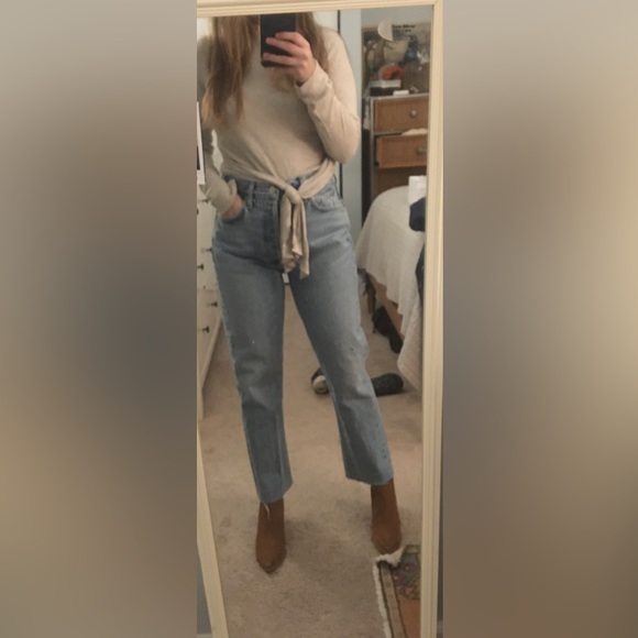 Very gently used Agolde Riley Cropped jeans. I did cut a little off the bottom for more of an ankle length on petite (I’m 5ft and they hit above the ankle like in the first picture) please see picture with measurement for reference. High rise