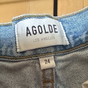 Stylish high rise jeans by Agolde. Light blue with distressed details. Perfect for casual wear.