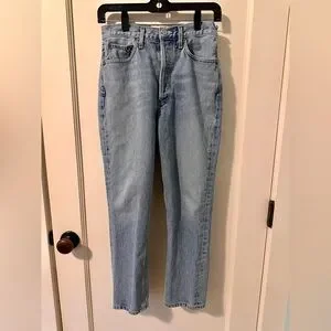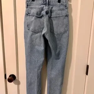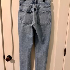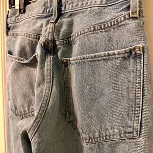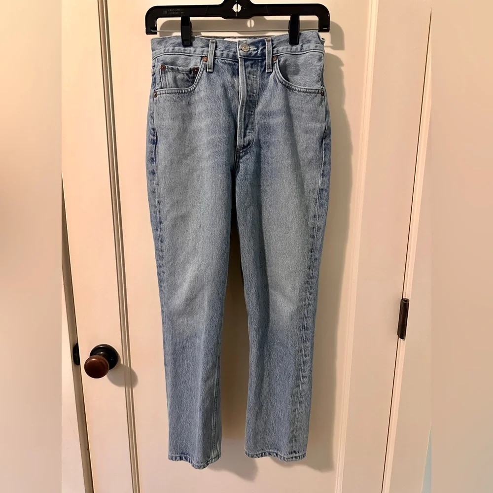 Agolde Riley high rise jeans. Light blue wash with button fly. Inseam is 24 in. Good condition, no visible flaws