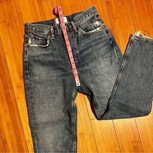 Classic straight leg jeans. Features a timeless blue wash. Perfect for casual wear.