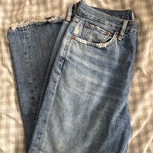 Experience timeless style with Agolde's high rise blue jeans, featuring a vintage wash that exudes a classic, lived-in appeal. The denim's natural fading and subtle color variations add an authentic touch to your everyday look.