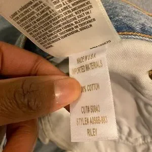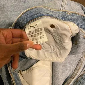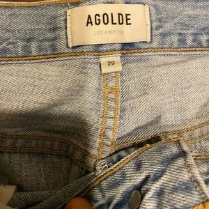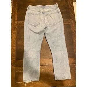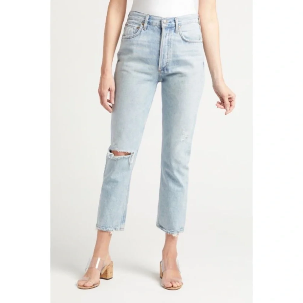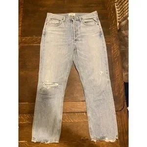 Agolde Riley High Rise Straight in a size 29. Featuring a modern high rise straight leg silhouette, with authentic 100% cotton denim, and a light blue wash with vintage appeal. Distressing at hems and knee. Excellent used condition.