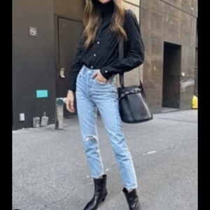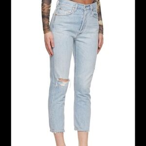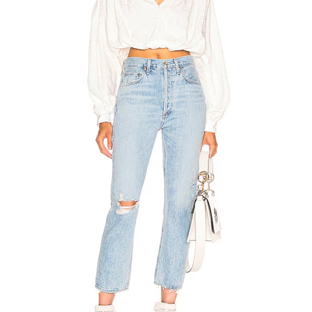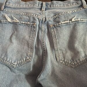 Elevate your style with these light blue distressed jeans. Perfect for a casual day out, these jeans offer comfort and a trendy look. These are a button fly closure. They have distressing throughout these are in gorgeous condition
