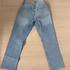 Stylish light blue cropped jeans. Features a trendy distressed knee. Perfect for casual wear.