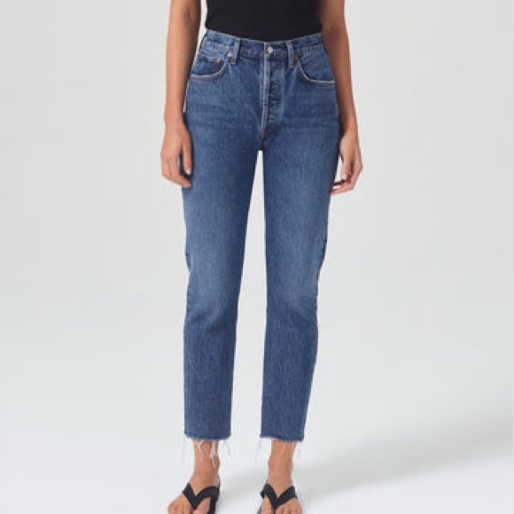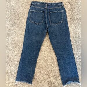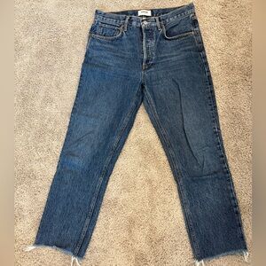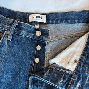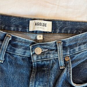 Great quality Agolde jeans in dark wash. Slight distressed details. Great condition.