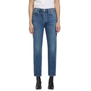 Agolde Riley Hi-Rise Straight Leg Crop Denim Jean in Transfer Blue. AGOLDE's signature straight leg. With a better-than-vintage aesthetic, the Riley is an iconic brand favorite. The flattering high-rise and straight leg hold close to the body for a universally loved look. A cropped inseam makes these easy to style with anything from sandals to a heeled boot. Great used condition.