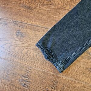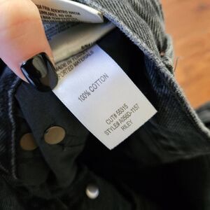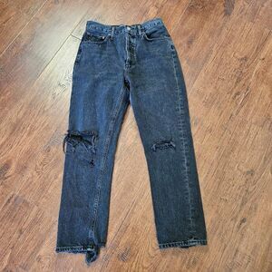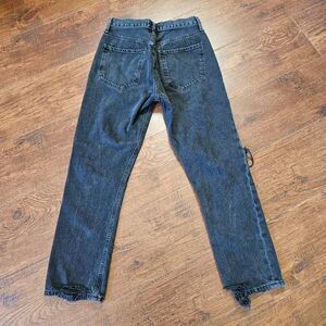 Straight-leg Riley denim jeans in black, by Agolde. High-rise. Cropped leg. Fading and distressing throughout. Five-pocket styling. Belt loops at waistband. Rip at knees and ankle hems. Multi button panel fly.