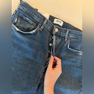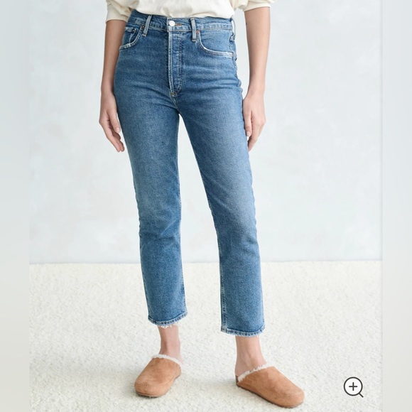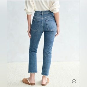 High rise jean with straight leg, cropped length, and button fly. Crafted from stretch denim with a 26" inseam.