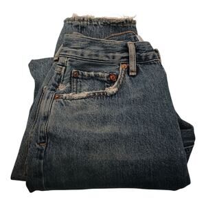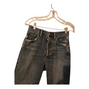 In good condition please review the photos measurements are in them. The Agolde Riley Jeans in Blue are a stylish and versatile addition to any woman's wardrobe. These high-rise, straight-cut jeans feature factory distressed, button fly and a cropped length, perfect for showcasing your favorite footwear. Made from 100% cotton denim, these jeans offer a comfortable fit and a flattering silhouette. The solid blue color and medium wash make them versatile for all seasons, while the 5-pocket design adds both functionality and style. Perfect for casual outings or dressed up with heels, these Agolde jeans are a must-have for any fashion-forward woman. NO STRETCH