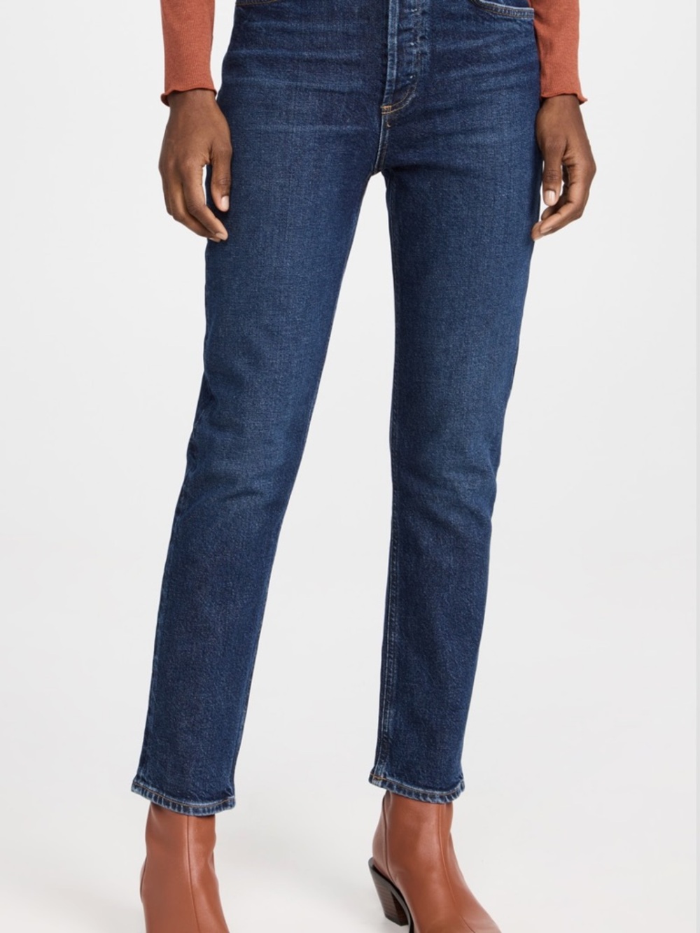 These high-rise straight jeans deliver a clean, timeless silhouette. The dark blue color offers versatile styling for day or night. Comfortable stretch denim provides all-day wear. Pairs easily with boots or sneakers for a polished casual look.