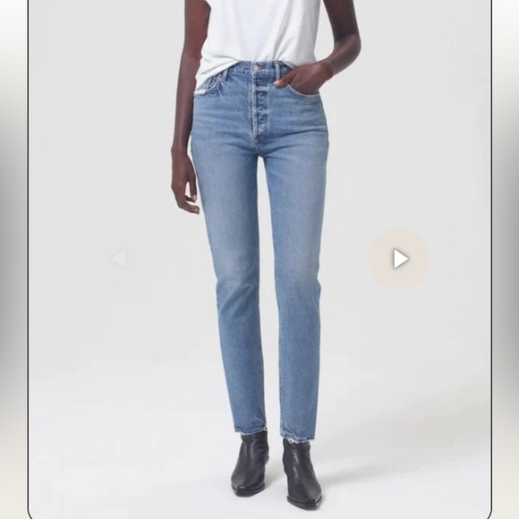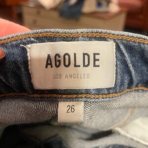Classic high-rise, straight leg jean by Agolde. Perfect for Casual wear with a white t-shirt and bootie. The “wear” on this jean is really well-done- focusing on the bottom hem and front pocket. Frequency wash (Medium Blue). Button fly, 26” inseam and 100% cotton. Super flattering and effortlessly cool.