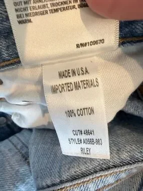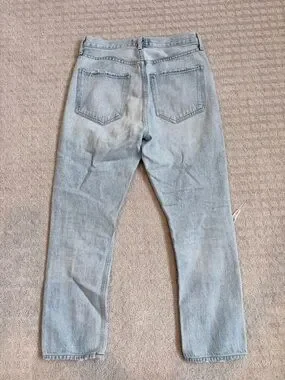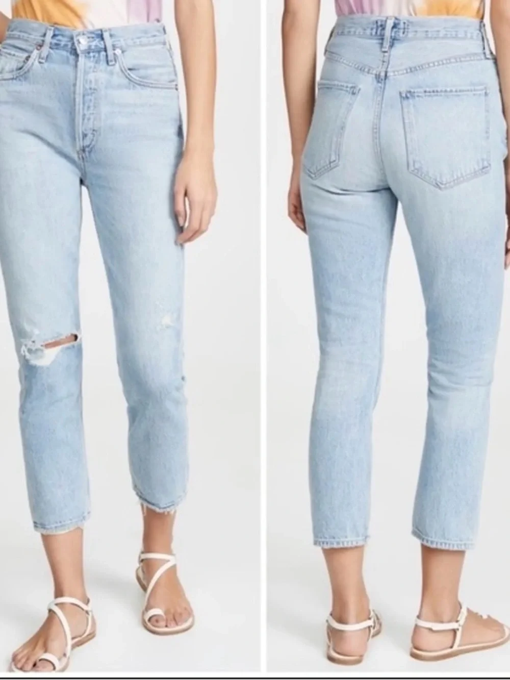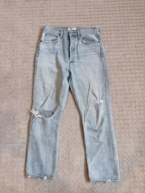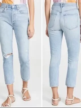 High-rise cropped women's jeans by Agolde. Light blue denim with a subtle knee rip and raw hem. Button fly. No stains, tears or rips (other than original distressing). Wash is Shatter.