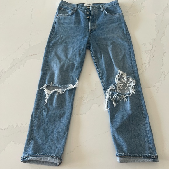 Agolde Riley jeans, two holes on front. They are cropped style depending on your height. Size 28