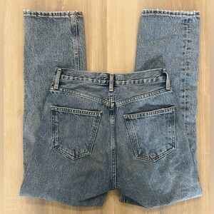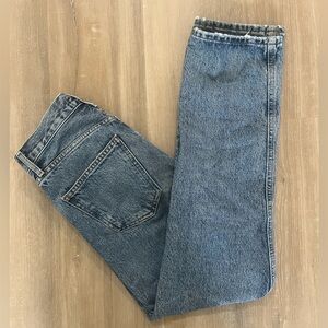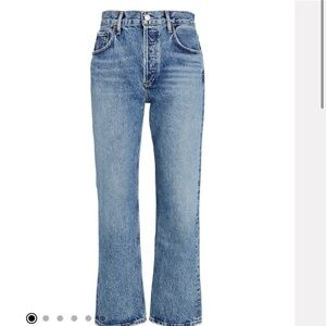 Agolde Ripley Jean in size 23. Color is Forfeit. They are advertised as a straight cut rigid denim jean. These are used and have slight signs of wear on the front rick pocket and back pockets. Stitching and buttons are still in great shape.