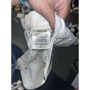 The product is a pair of Agolde women's white Parker long high rise fly button frayed shorts in size 25. These denim shorts feature a high rise waist with a button closure, a 5-pocket design, and a 4-inch inseam. The casual style and solid color make them perfect for summer and spring occasions. Made from 100% cotton, these shorts are machine washable for easy care and are designed by the brand AGOLDE.