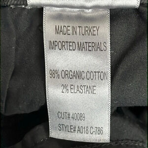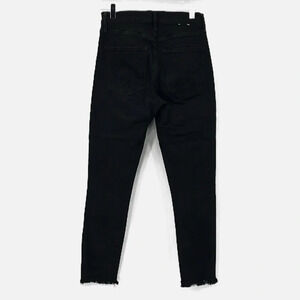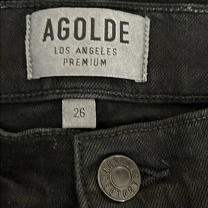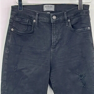 Agolde Sophie Feel Good Skinny Distressed Raw Hem Jeans in Black - Size 26. Excellent pre-owned condition. Factory distressing, zip fly with button closure, 5 pockets, stretch, raw hem, organic cotton and elastane fabric blend. Approximate measurements: 13 1/2" waist, 10" rise, 26" inseam.