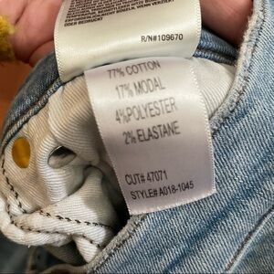 High waisted / high rise. Light blue denim wash. 77% cotton, 17% model, 4% polyester, 2% elastane.