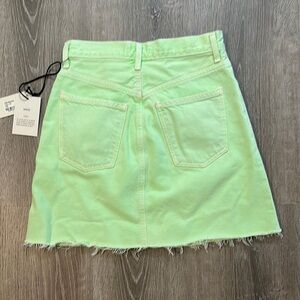 This vibrant green mini skirt by Agolde is perfect for casual and resort wear. Its A-line silhouette offers a flattering fit, while the structured denim fabric ensures a chic and polished look. The raw, frayed hem adds a touch of laid-back style, making it an ideal choice for sunny days. Excellent new condition. Waist 13, length 17.