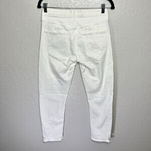 Make a modern yet classically-cool statement in these crisp-white skinnies, updated with a high waist and edgy distressing.