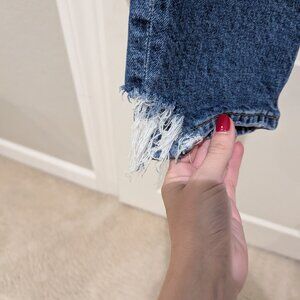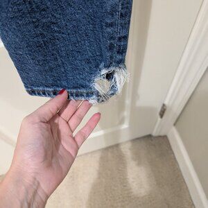 Gently used Agolde Toni jeans in Stratosphere. Only worn a couple times and in excellent condition, no flaws or stains. Distressed fray detail on pockets, and on ankles - which there creates a side stirrup like effect. Smoke-free home.