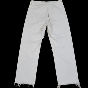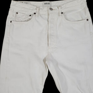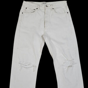 Agolde Women Distressed Raw Hem Cotton Straight Button-Fly Jeans in size 28 with a 27" inseam are a stylish and comfortable choice for women. Made from denim fabric with a distressed finish, these jeans feature a mid-rise waist and a straight leg fit. The button-fly closure adds a touch of retro vibe to the design. With a 5-pocket design and a solid white color, these jeans are perfect for all seasons and can be easily machine washed for care. AGOLDE, a popular brand known for its high-quality products, ensures that these jeans are both trendy and durable for everyday wear.