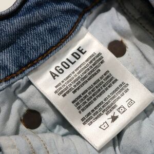The product is a pair of Agolde Women's Blue Denim Distressed High-Rise Button Fly Cropped Jeans in size 25. These jeans feature a solid blue color with a medium fabric wash and a high-rise fit. They have a button closure and a cropped style, making them an on-trend and stylish choice for summer. The jeans also have a 5-pocket design, reflecting a classic theme. Perfect for casual wear during the warmer seasons, these Agolde jeans are a versatile addition to any woman's wardrobe.