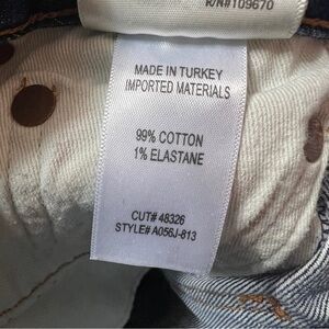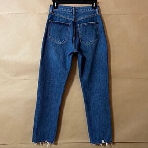Stylish high rise jeans. Dark blue denim. Frayed hem detail. Perfect for casual wear.