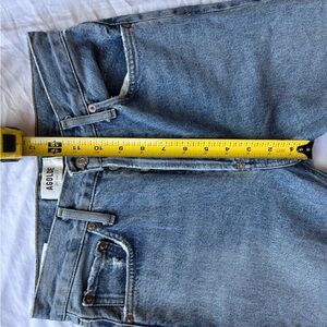 Classic high-rise silhouette. Straight leg fit. Five-pocket styling with metal rivets. Light wash with subtle fading. Clean, versatile look.